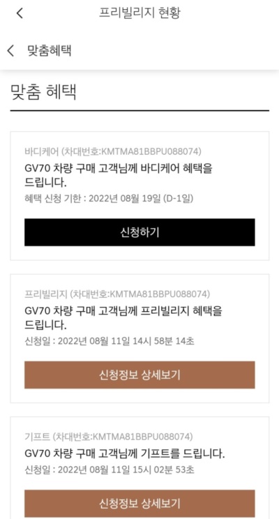 제네시스를 구매하신 분들에게는 다양한 멤버십 서비스가 제공됩니다. 차량 모델별로 서비스는 상이합니다. 저는 GV70을 구매했으며 멤버십 프리빌리지와 기프트 신청 역시 완료했습니다. 직접 신청해야 받을 수 있는 혜택이니 만큼 꼭 해보시기 바랍니다.